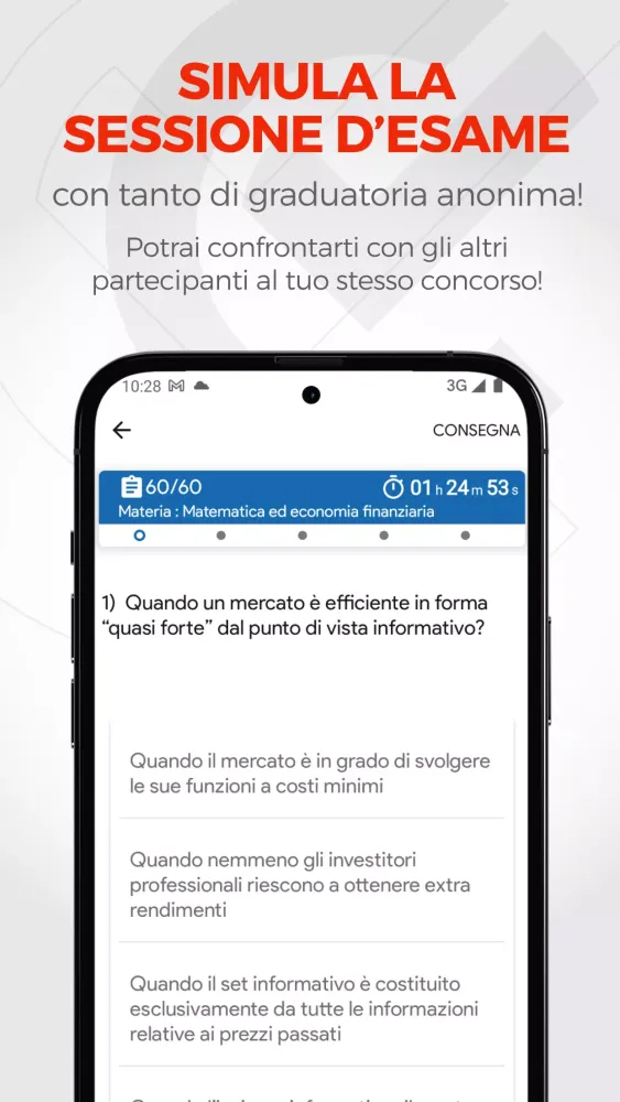 The "Concorsando.it" quiz simulator is an indispensable tool for anyone preparing for public competitions and admission tests. With over 4 million quizzes and more than 1 million users, this application stands out as the premier choice in its category. The simulator provides access to official databases for the competitions you're interested in, ensuring that you get accurate and relevant practice material.