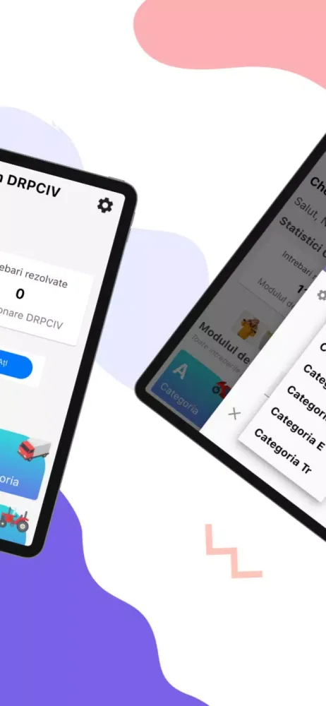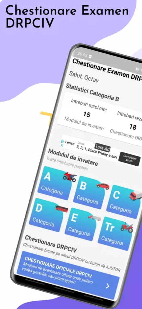 The "Chestionare Auto Examen DRPCIV" application is designed to help you prepare effectively for your driving license exam. It covers a wide range of categories including A, B, C, D, E, and Tr, ensuring that all aspects of your theoretical knowledge are thoroughly tested.