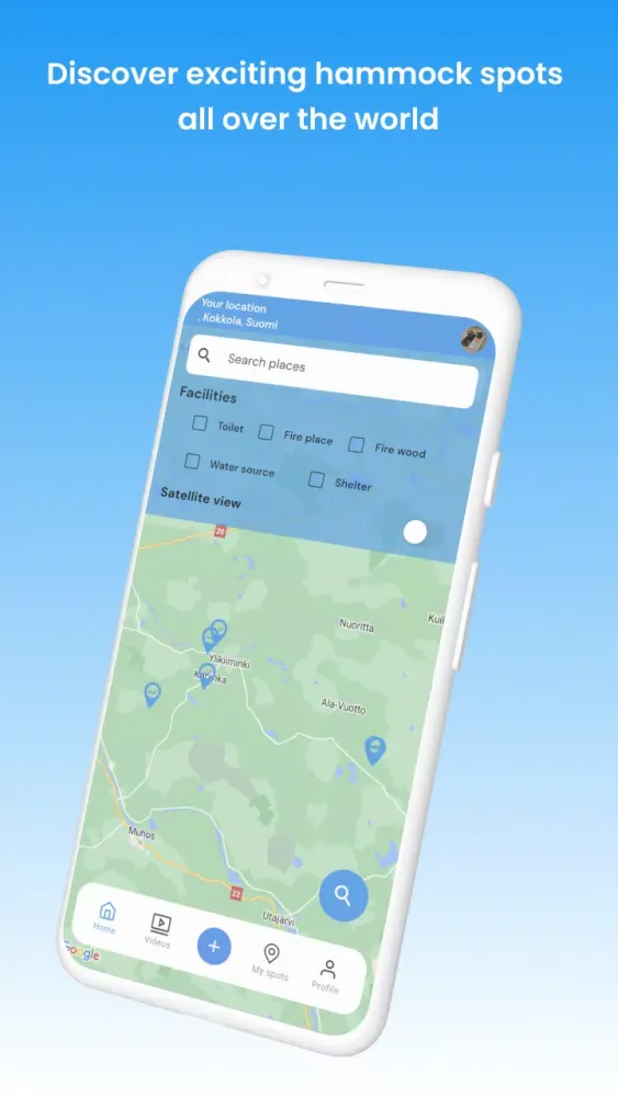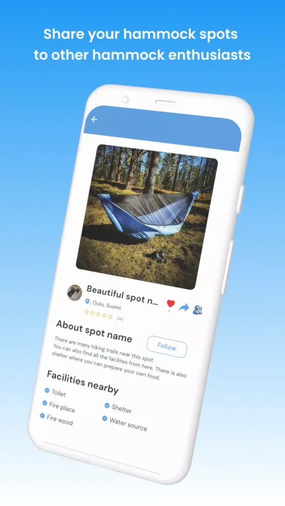 Using our intuitive map, Hammock Spot helps you pinpoint the best locations near you. You can filter spots by facilities, view photos, watch videos, and read reviews from other hammock enthusiasts. Say goodbye to the hassle of searching for the perfect trees or posts to hang your hammock—let the app guide you seamlessly.