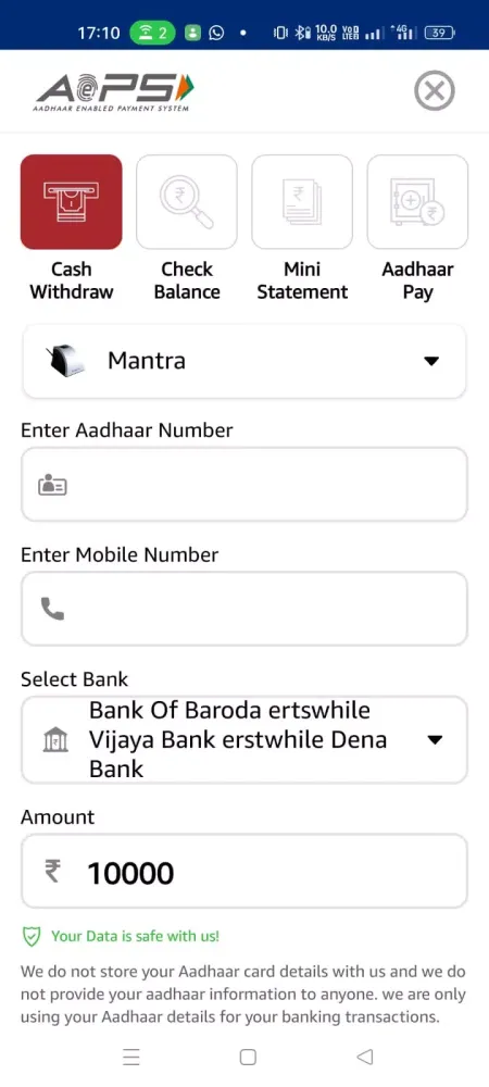 Experience seamless banking with our AEPS services. We offer cash withdrawal and Aadhaar-enabled payments for all banks, along with mini statements and balance inquiries, providing you with easy access to essential banking information.