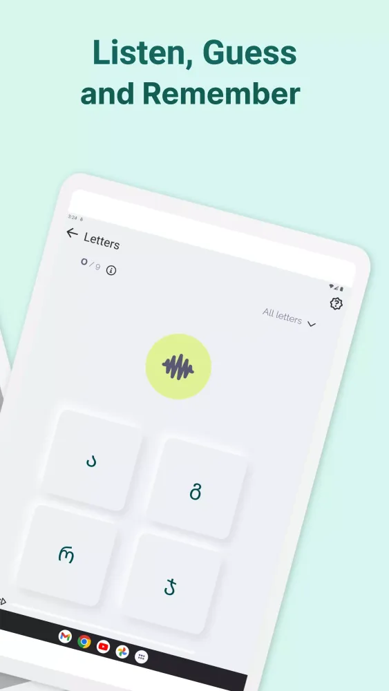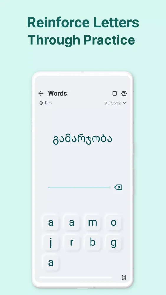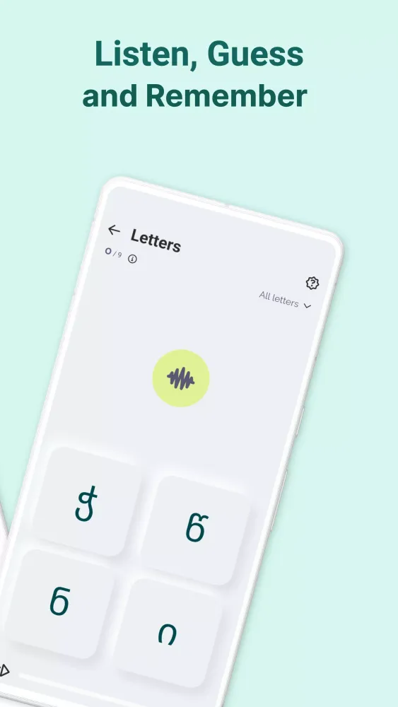 Once you've familiarized yourself with the basics, Kartuli takes your learning to the next level with practical exercises. The "Words" feature allows you to reinforce your knowledge of individual letters by practicing them in context. This approach helps solidify your understanding and builds confidence as you progress. Additionally, the app offers listening practice, where you must identify letters and numbers based on their sounds. Presented with four options, you'll sharpen your listening skills while reinforcing your grasp of the language. These exercises are designed to be both challenging and rewarding, ensuring that you remain engaged throughout your learning journey.