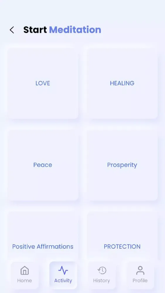 When you open the QUIRK app, you'll be prompted to choose an activity: walking, running, or meditation only. Next, select the duration of your session—ranging from 15 minutes to a full hour. Once you've set your preferences, the app provides you with a selection of topics to meditate on, such as love, peace, healing, prosperity, protection, and positive affirmations.