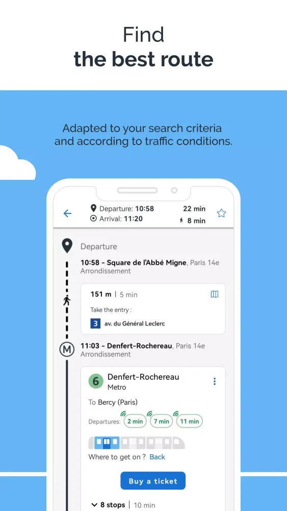 In addition to ticket management, the app offers robust trip planning capabilities. You can locate nearby bus stops, train stations, and subway stations, and search for real-time public transport, carpooling, and bicycle routes. The app provides up-to-date information on the next passages of your lines and all timetables. It also lets you save your upcoming trips on your phone's calendar and view public transportation network maps, even when offline. The app also includes detailed pedestrian route guidance for walking sections.