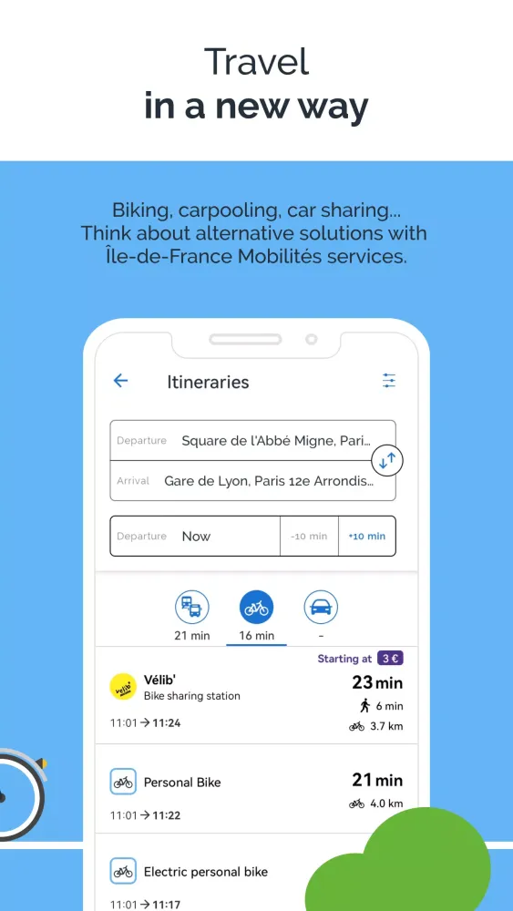 For those who prefer eco-friendly travel, the app encourages the use of soft or alternative modes of transport. It suggests bike routes for all your trips and allows you to book carpooling and carsharing trips through partnerships with major French providers. You can rent a car or utility vehicle for short periods by selecting a Communauto car-sharing vehicle from a variety of stations near you, and reserve it instantly for your chosen duration.