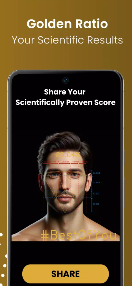 Unlike any other application, Best Of You utilizes the golden ratio to analyze your facial features. Discover how your facial proportions align with this timeless aesthetic principle and receive a detailed appearance score. This unique analysis helps you understand and maximize your natural beauty.