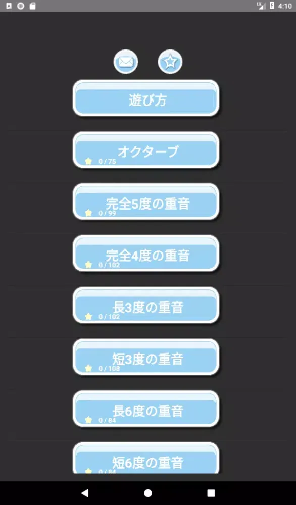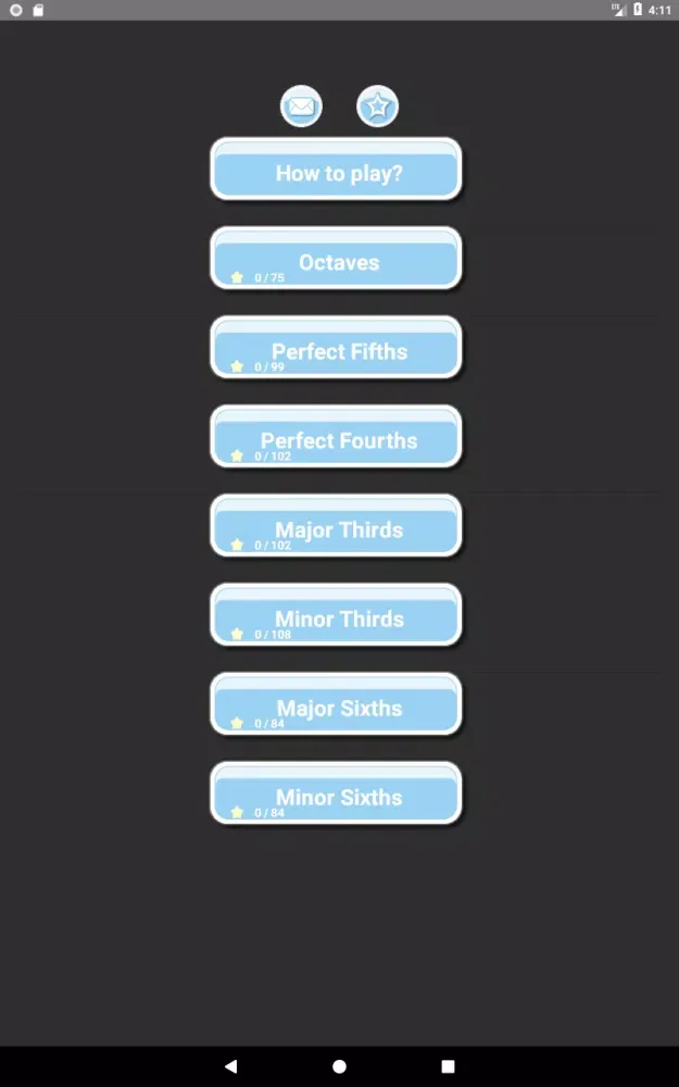 Originally developed as a sequel to a previous music game, this app now focuses specifically on learning double-stop notes using just intonation. Double-stop notes are played simultaneously, and your task is to identify the correct just intonation interval. For instance, when matching a major third between "do" and "mi," the interval in equal temperament is 400 cents, while in just intonation, it is precisely 386.3 cents.