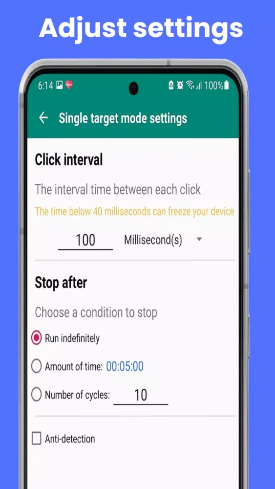 - Detailed Click Settings: Customize the delay, touch duration, and number of repetitions for each click, giving you fine-grained control over your automation.