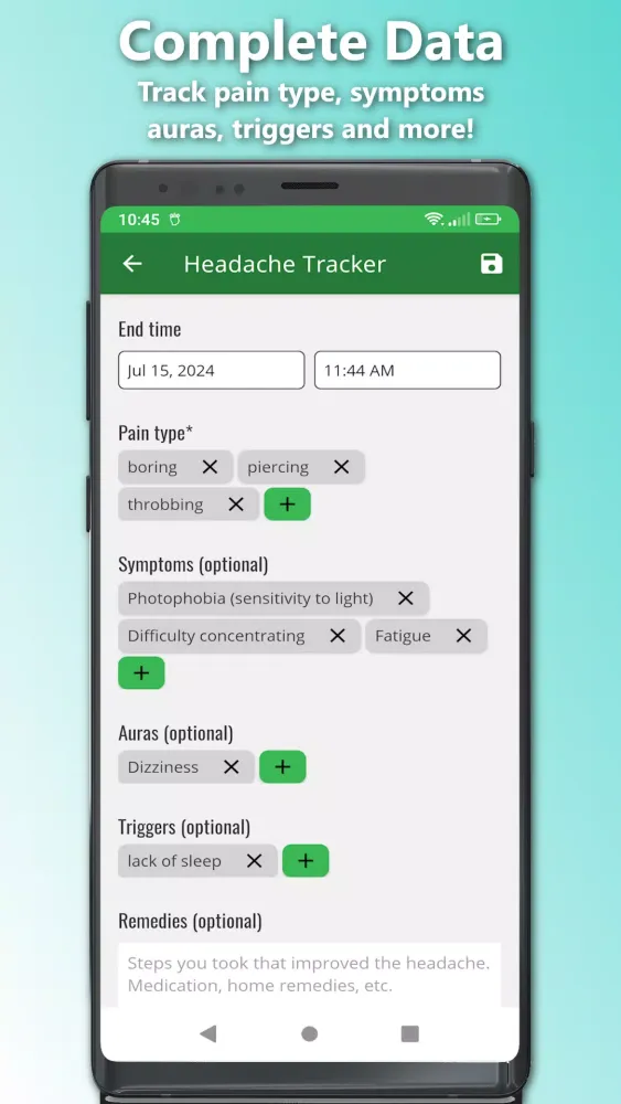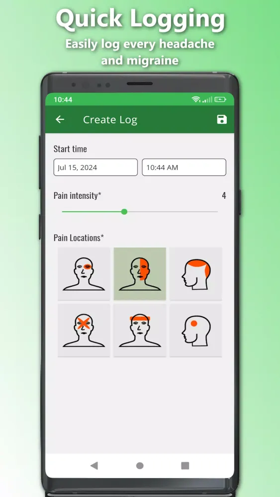 - Easy Logging: Record the details of your headaches effortlessly. Note down the duration, severity, pain location, pain type, and any potential triggers.