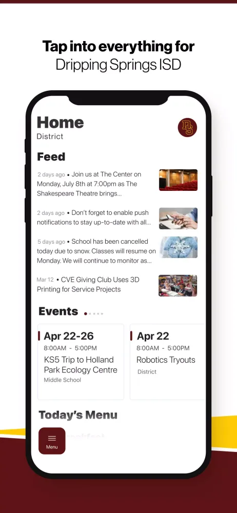 Dripping Springs ISD, TX is proud to introduce its official Android application, designed to keep students, parents, and community members connected and informed. This app serves as a comprehensive tool to enhance communication, streamline access to important information, and ensure that no event or update is missed. Whether you're a parent looking to stay updated on school activities or a student needing quick access to cafeteria menus, this app has everything you need.