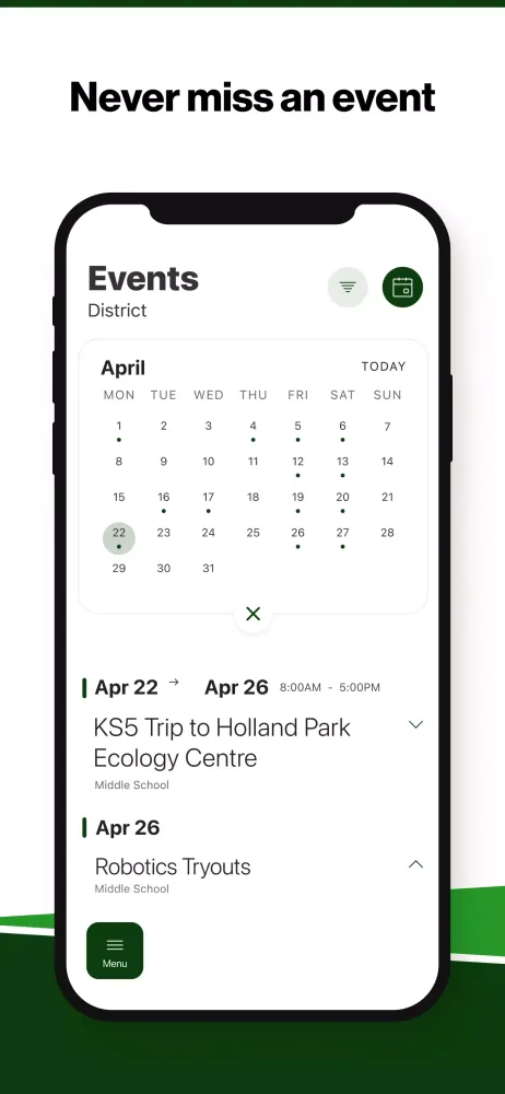 The dining section of the app provides an easy-to-navigate weekly menu for your student’s organization. Sorted by day and meal type, this feature ensures that you know exactly what meals are being served each day. Planning meals has never been easier!