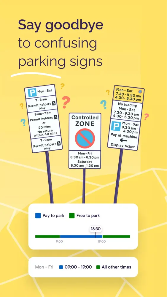 Simply enter your destination, and we'll show you the most affordable or nearest parking spots available, including those on single yellow lines. No more wasting time circling blocks!