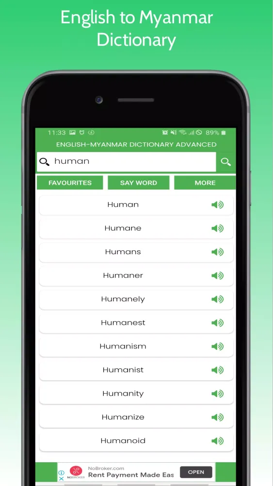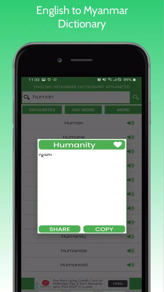The app offers a variety of practical tools such as the ability to share words and meanings via social media platforms like WhatsApp, Gmail, SMS, and Hangouts. Users can also save favorite words directly to the app’s favorites section, which is easily accessible from the search bar. Another useful feature is the text-to-speech functionality, enabling users to listen to the pronunciation of English words. Furthermore, the app allows users to copy both the English word and its Myanmar translation, facilitating seamless integration into documents or notes.