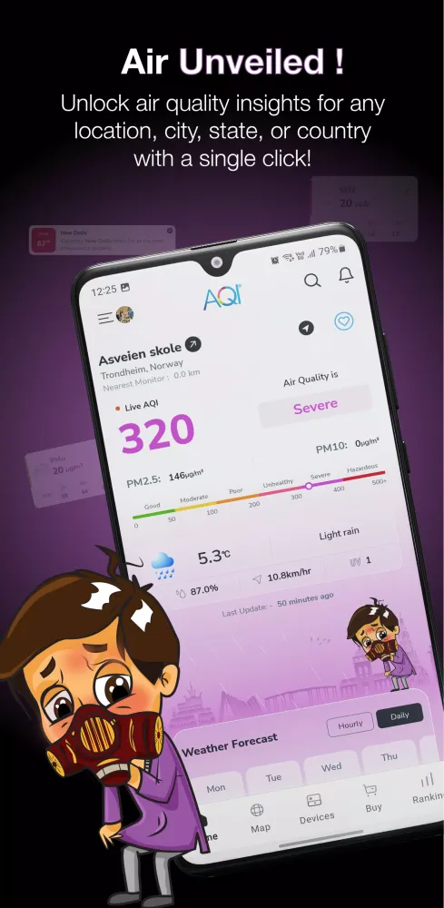 The AQI air quality index app provides real-time air pollution and weather updates from the nearest air quality monitoring station to your current location. It also alerts you about any nearby open fires in near real-time. With data from over 10,500+ tracking stations globally, you can plan your outings and holidays with peace of mind.