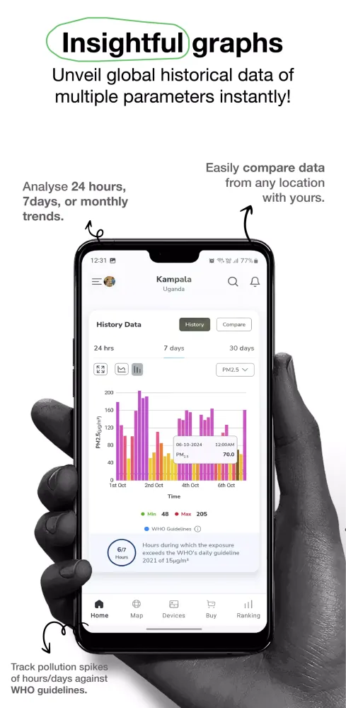 Receive real-time air quality index with an easy-to-understand graphical representation for better insights into the air you are breathing. Access historical data for spatial or temporal comparisons and plan your activities accordingly.