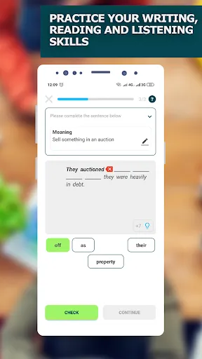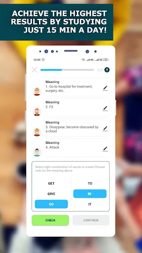 There are many exercises in the app for memorizing new words. There are flashcards with phrasal verb in the first part of the lesson. You can listen to the correct pronunciation, take a look at the definitions and up to ten usage examples. If you already know this phrasal verb, you can skip it and proceed with the next one. After that, you should pass a test to consolidate already learned phrasal verbs to define your weakest points. In third part of the lesson, you need to complete sentence, which contains learned word, using words in the right order. You can also choose a goal for the day and track your progress with a convenient interface. To get you the highest results and do not let you forget about repeating, we have added notifications.