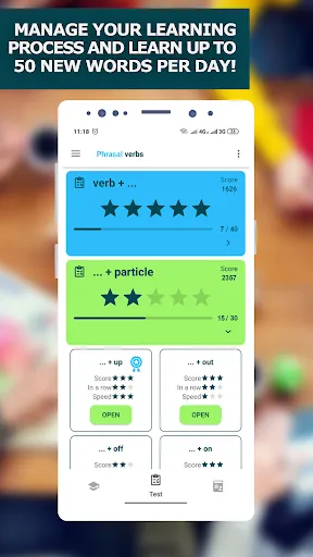There are more than 10,000 phrasal verbs in English. Since they cannot been translated verbatim, you just need to learn and memorize them. In this words booster app we have collected more than two thousand the most usable phrasal verbs for learning and mastering and made user-friendly interface, which helps to make learning process quit simple and fast.