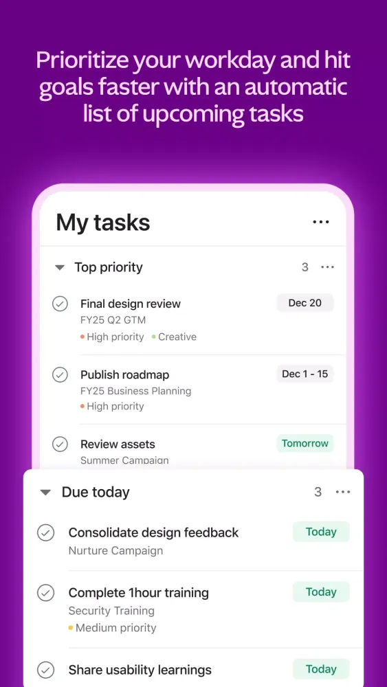 Experience the power of Asana today. Download the work management app and start transforming the way you and your team manage projects.