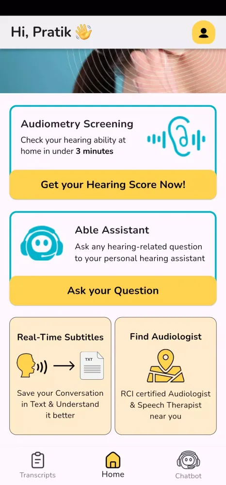 Able Assistant is not just a tool; it’s a commitment to promoting early detection and improving overall hearing healthcare in India. Completely free to use, the app embodies our mission to empower individuals with the knowledge and resources necessary to take charge of their hearing health. From initial assessments to ongoing support, Able Assistant is designed to be your trusted companion in the fight against hearing loss. Download the app today and take the first step toward better hearing health!