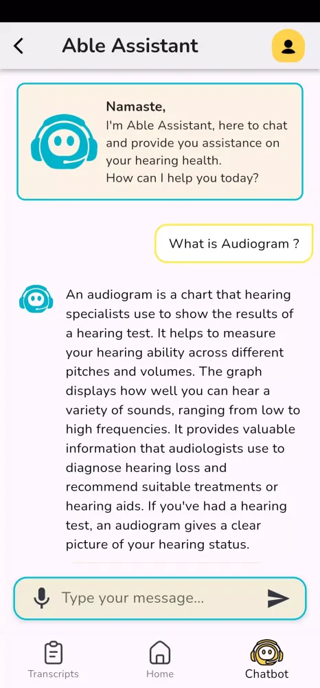For those who require additional support, Able Assistant’s virtual Audiologist powered by LLM (Large Language Model) technology is always available. Available round-the-clock, this feature allows you to ask any hearing-related question and receive clear, concise responses. Additionally, the app supports communication in both text and audio formats, ensuring personalized guidance that adapts to your preferences and needs. Whether you’re navigating the complexities of hearing aids or exploring treatment options, Able Assistant is here to assist every step of the way.