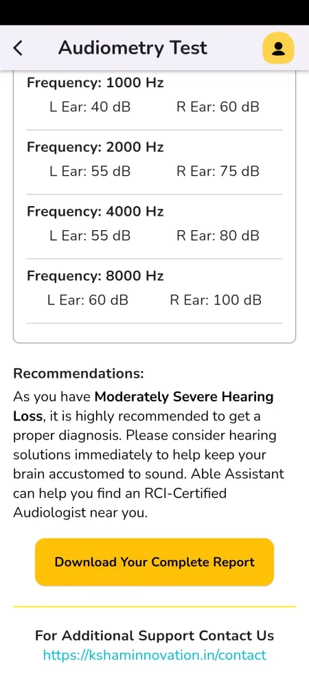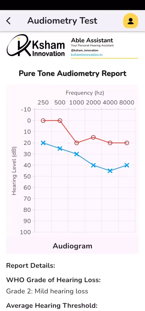 At the heart of Able Assistant lies its quick and user-friendly audiometry screening tool. In under three minutes, you can complete a comprehensive hearing test for both ears. The app generates an instant audiogram report, breaking down your results into easily understandable terms using the World Health Organization (WHO) grading system. This grading helps you identify the severity of your hearing loss at a glance. For instance, Grade 1 signifies normal hearing, while Grades 2 and 3 indicate mild to moderate hearing loss, prompting timely intervention to prevent further damage. Grades 4 through 6 correspond to increasingly severe hearing impairments, underscoring the importance of seeking professional help without delay.