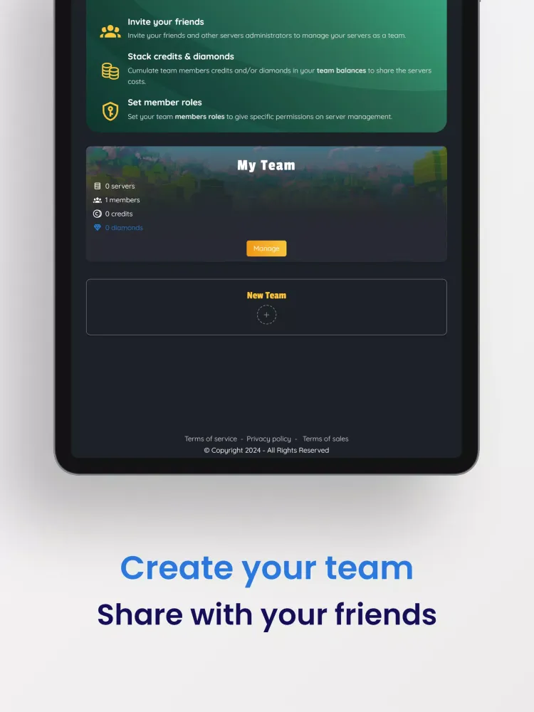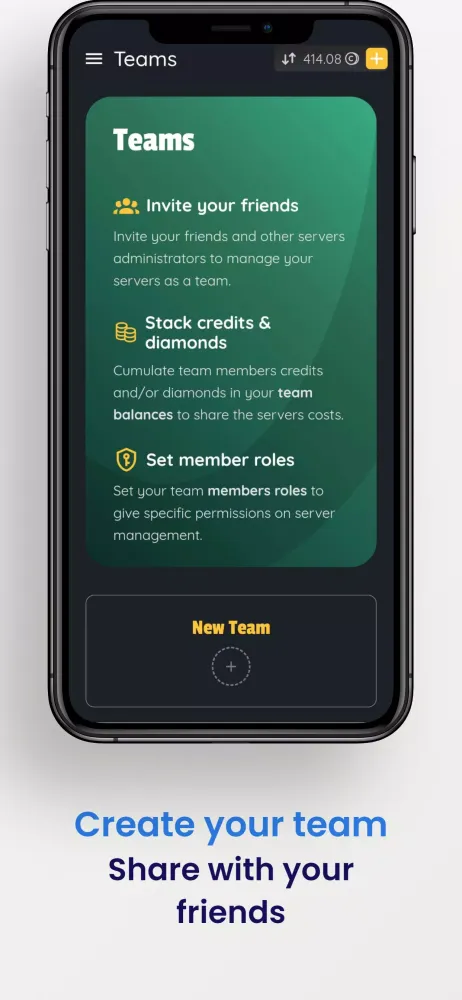 - Create teams with friends to manage servers, stack credits, and play together