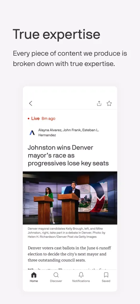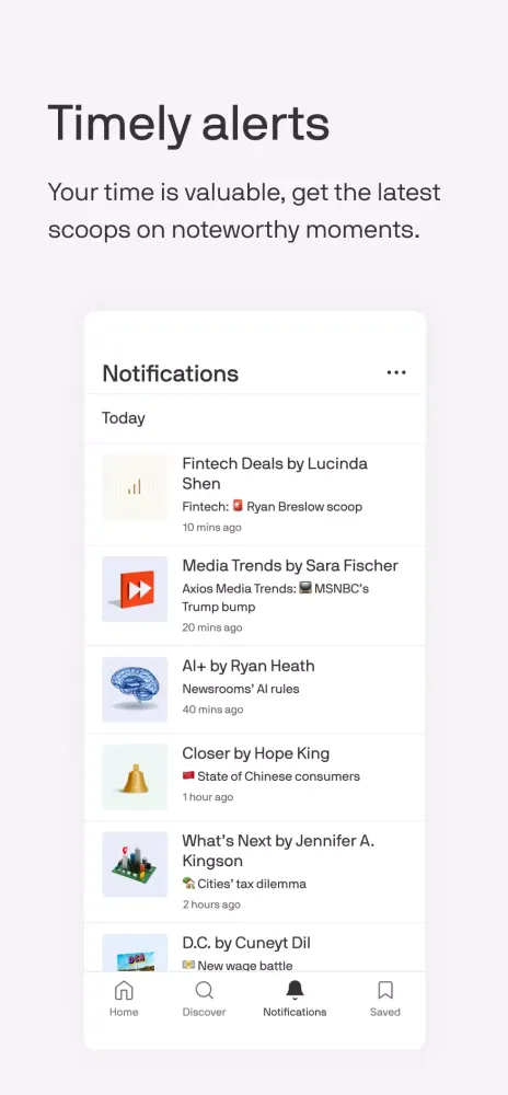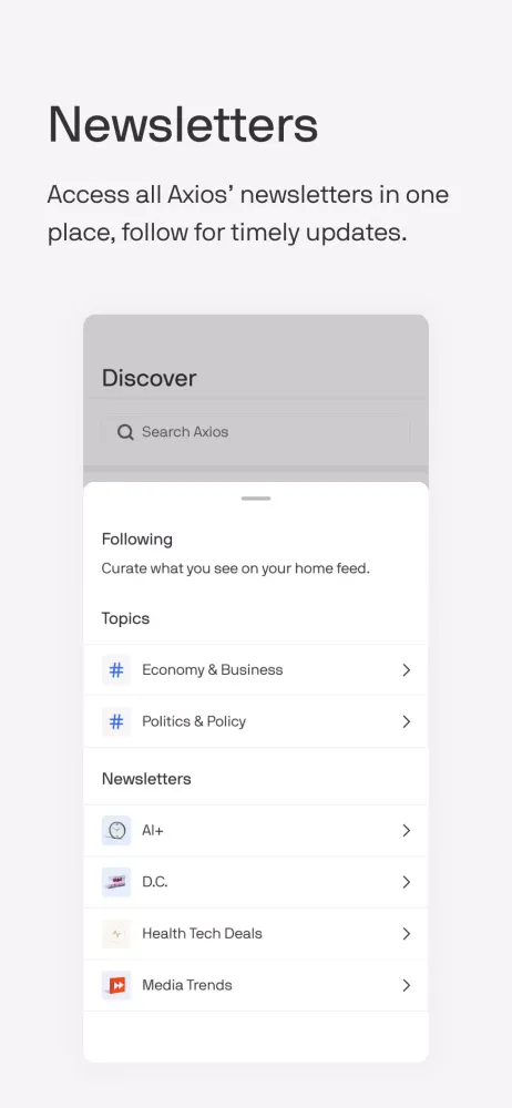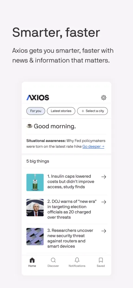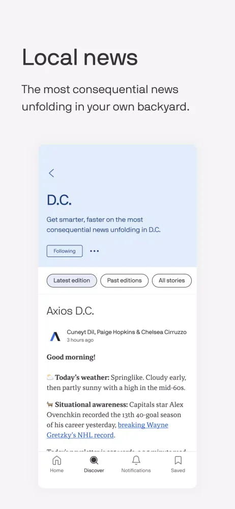 The Axios app offers a streamlined reading experience tailored to your interests. By following specific channels that align with your preferences, you can easily access the content that matters most to you. The app features a single integrated feed or allows you to navigate between channels, ensuring that you stay informed without feeling overwhelmed. Additionally, our journalists will send you timely notifications for noteworthy events, helping you stay on top of the latest developments.
