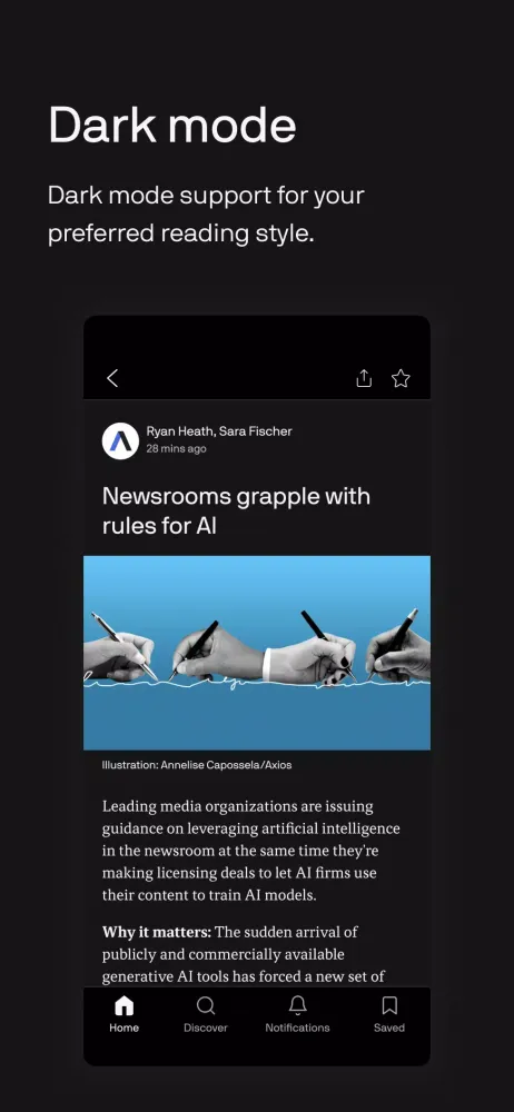 One of the standout features of the Axios app is its offline functionality. This means you can catch up on the latest news even when you're not connected to the internet. Whether you're traveling or simply in an area with poor connectivity, you can rely on the app to provide you with the most recent updates. Furthermore, the app includes Dark Mode support for Android 10, which not only protects your eyes during nighttime reading but also helps conserve your device's battery life.