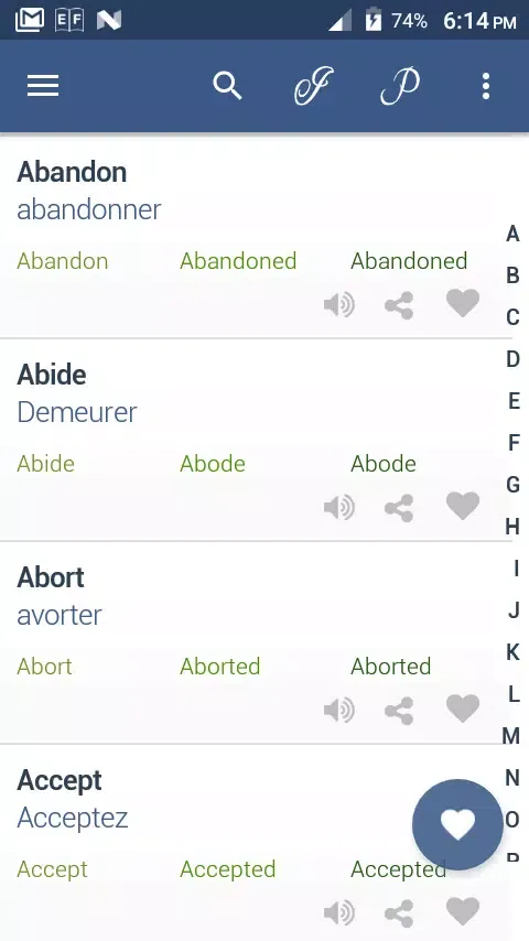 The app categorizes the verbs in a structured manner, making it easier for users to learn and retain information. Each category focuses on specific types of verbs or grammatical structures, allowing learners to concentrate on areas they find challenging. Additionally, Verb French includes a favorite option feature that enables users to bookmark important verbs for quick review and revision. This personalized approach ensures that you can focus on the words that matter most to you.