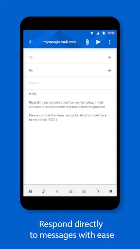 • Fully supports Android Enterprise deployment and, when allowed by your administrator, supports unifying your personal and work email accounts while maintaining strict data storage separation