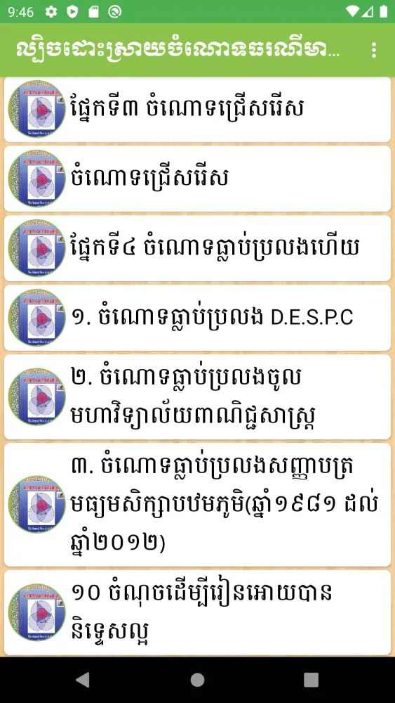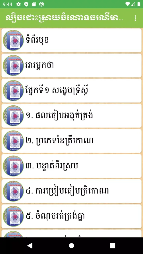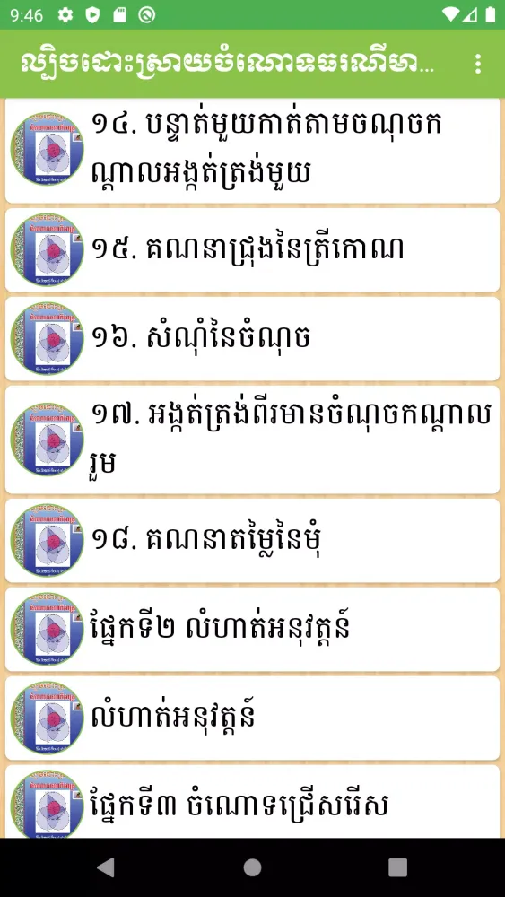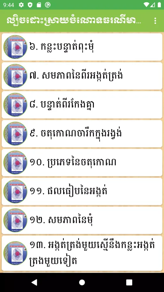 Beyond just geometry, this mobile app boasts an extensive library covering multiple subjects across various educational levels. It includes Khmer literature, mathematics texts, physics guides, chemistry handbooks, civics resources, geography maps, history chronicles, earth science materials, social studies textbooks, and even scientific journals. This diverse collection ensures that students have access to quality educational content regardless of their field of interest or current academic stage.