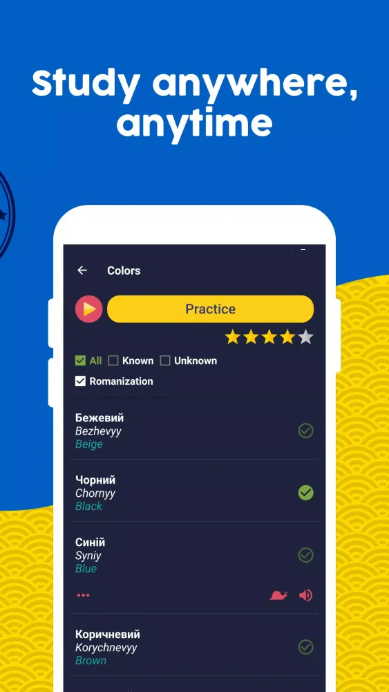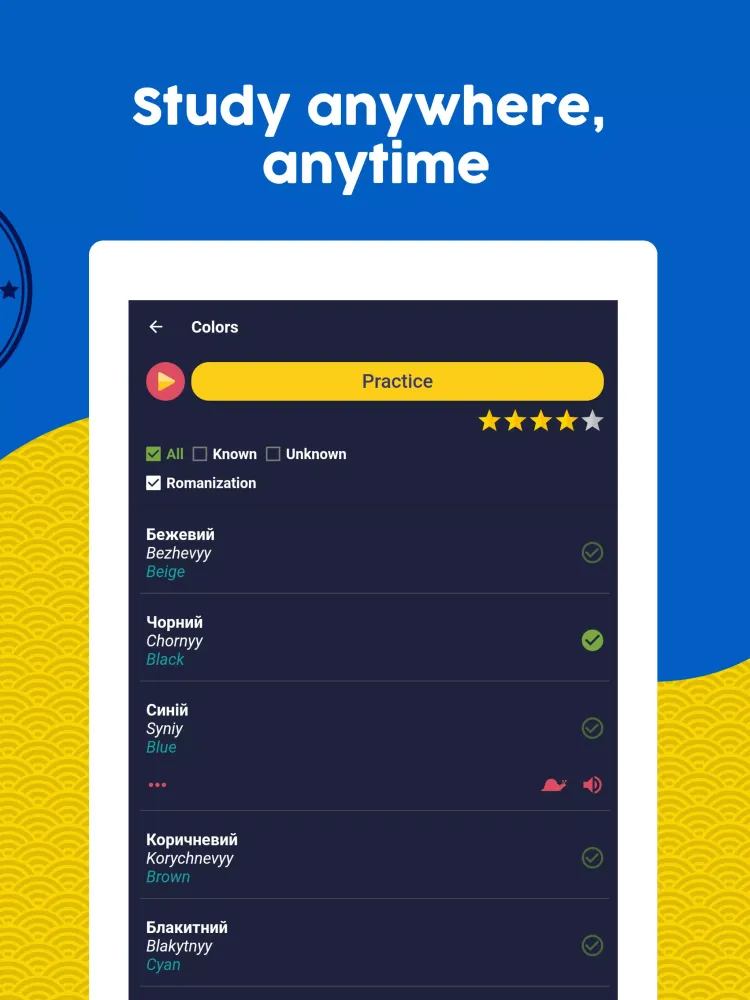 Start your journey with the basics—beginning with the alphabet—and progress seamlessly through various levels, from beginner to advanced. Every word is translated into English (or any other preferred language), ensuring a smooth transition into the Ukrainian language. Our extensive vocabulary selection caters to all levels, making it a one-stop solution for every learner.