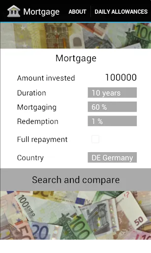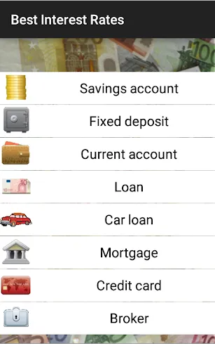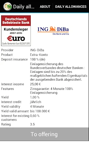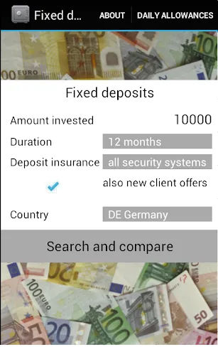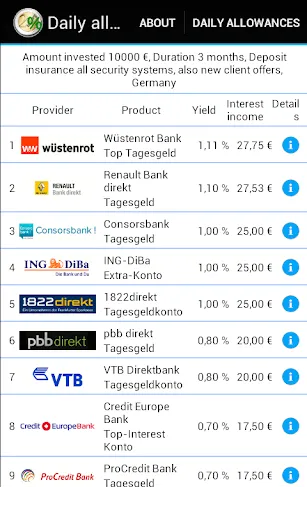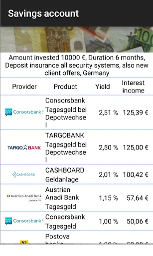 The financial comparison app lists daily conditions for interest-bearing deposits and loans, which are currently offered by banks and financial services in Europa.