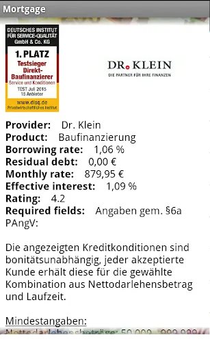 For each financial product infos can be obtained and the direct link to the provider can be accessed.