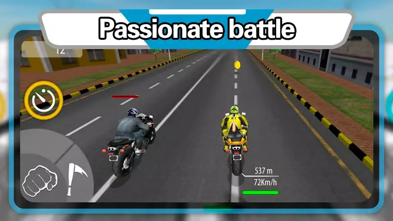 Tap the nitro button to zip through extreme traffic rush instantly. Kick and punch rival racers to divert their attention away from the highway racing tracks. Choose between two game modes: single player and multiplayer. Engage in multiplayer mode to compete with friends and family members. Explore the vast game garage where you can buy and upgrade your heavy bikes, select different costumes, and choose from an array of weapons. Ready to take on the enemy racers? Gear up and play this adrenaline-fueled racing game like a true bike rider.