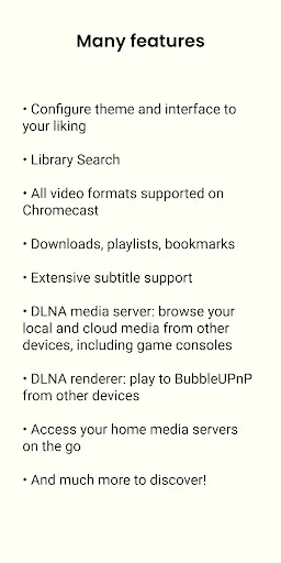‣ extensive Chromecast support: cast incompatible Chromecast media with smart transcoding (audio in videos in particular), subtitles with custom appearance, audio/video track selection**