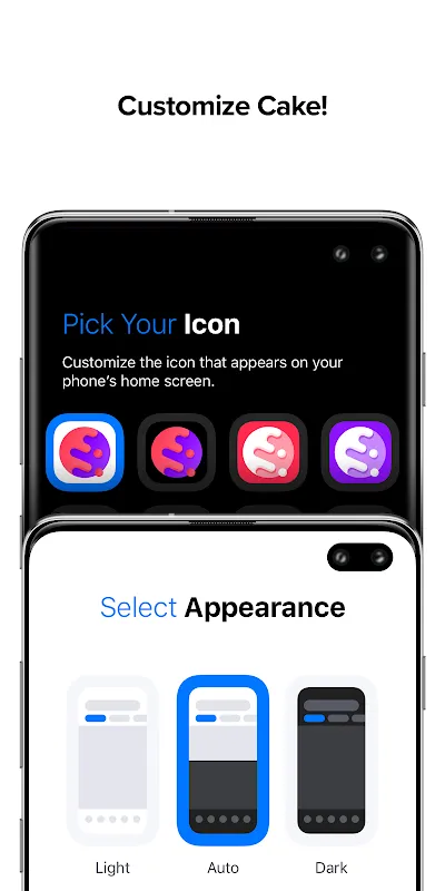 Personalize your Cake app icon (yeah, you can do that!). Choose from a library of icons to display on your home screen dock.