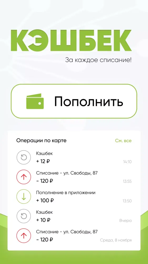 Convenient Replenishment: Top up your account directly from your bank card within the app. This streamlined process ensures that you always have enough balance for your car washes without any hassle.