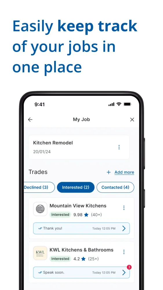 Communication is key when working with tradespeople. The in-app chat feature allows you to converse directly with the professionals, keeping all your interactions organized within the app. This eliminates the need to exchange personal contact information, providing an added layer of privacy and convenience.
