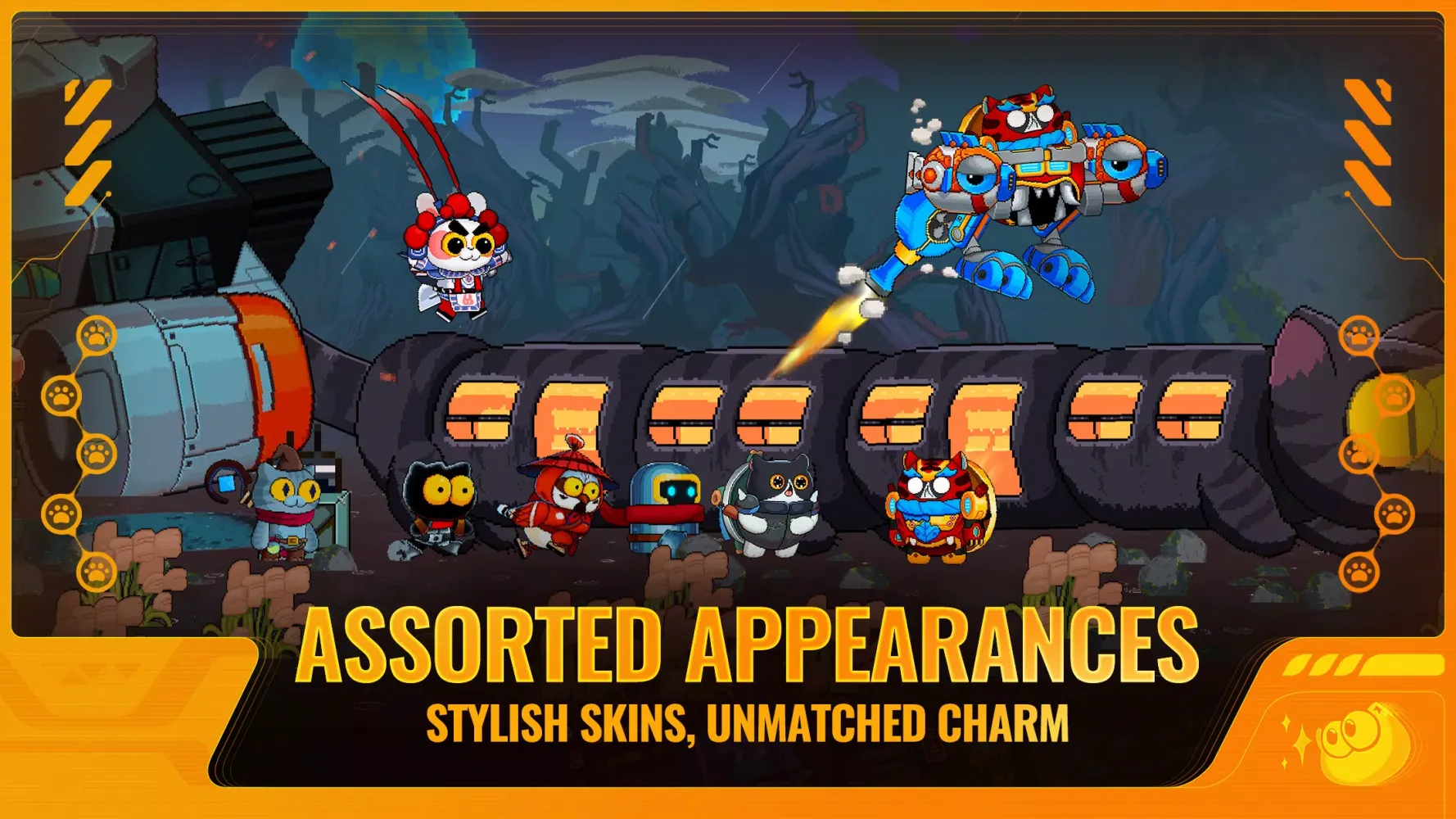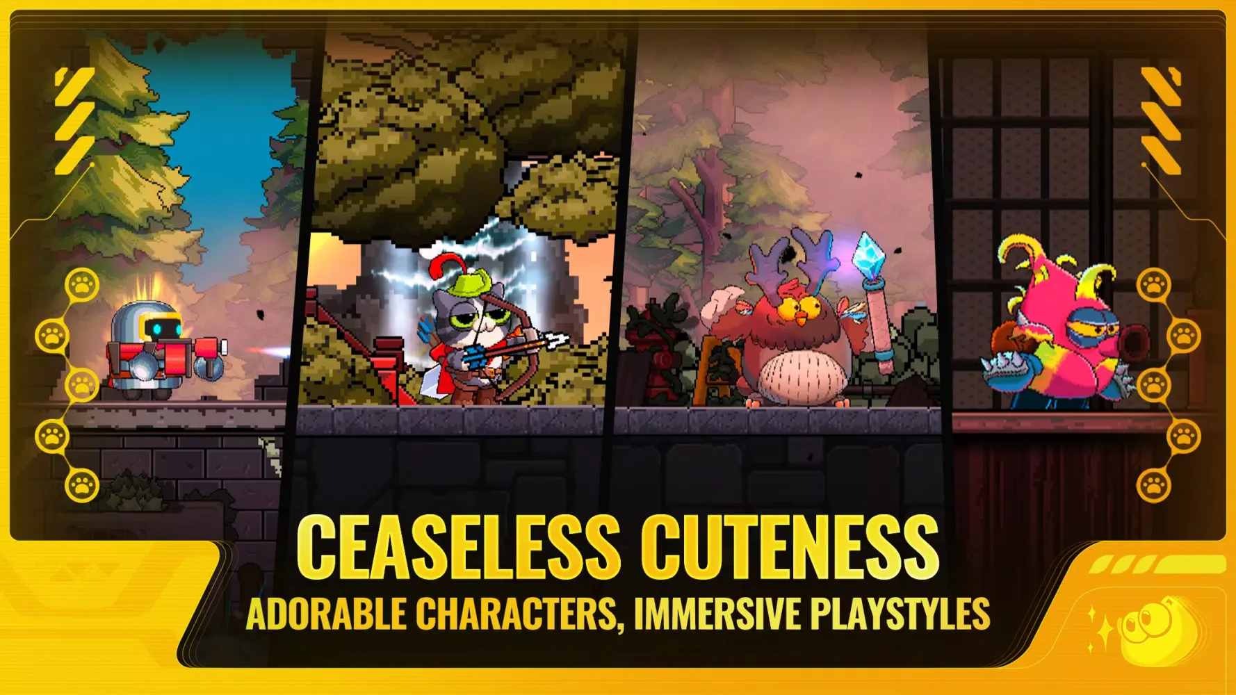 Cute cats are a must, but there's more! Meet the crafty Dragonbird, the hot-tempered Explorilla, the goofy Pitaya, the ninja Sparrow, and more. Each character boasts unique weapons, skills, and irresistibly charming personalities. From melee combat to shooting, magic to guns, or just being adorable, their competence extends across all fields.