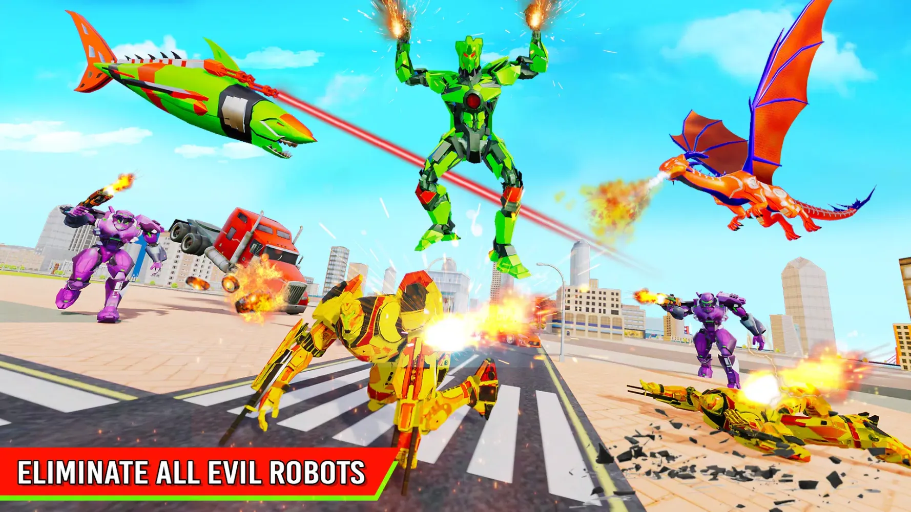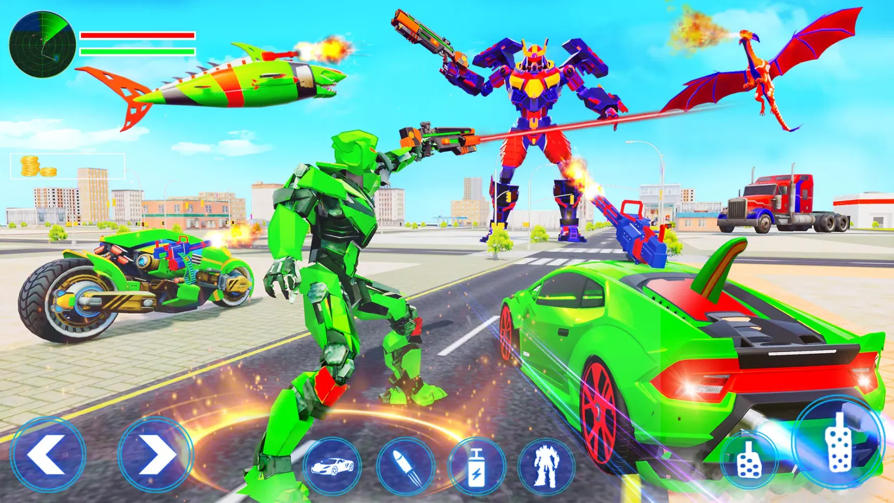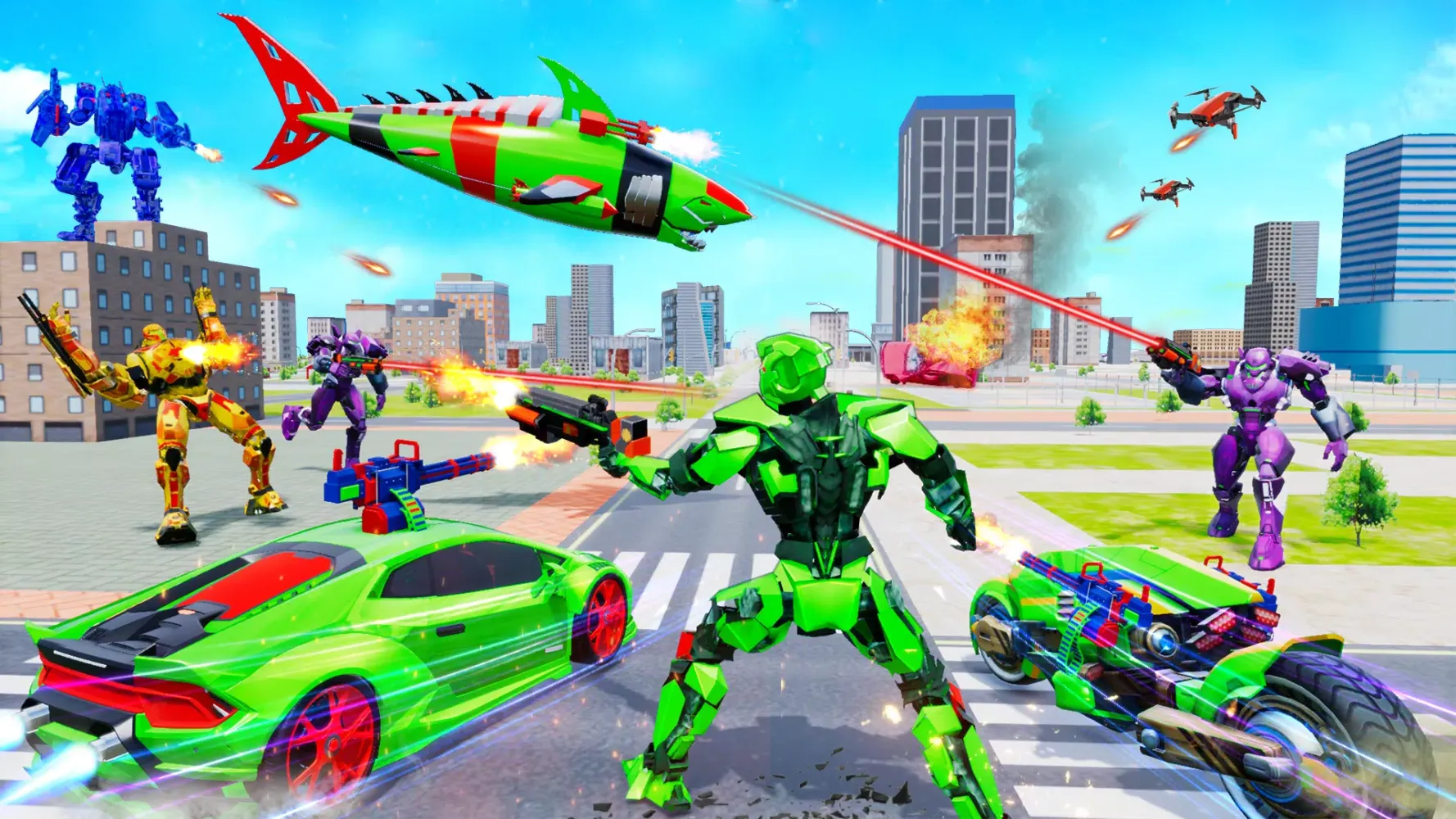 "Shark Robot" features state-of-the-art transforming robotics technology, allowing your robot to morph into both a flying car and a bike. This versatility adds an exciting layer of strategy to your gameplay, enabling you to adapt to different situations with ease. The game also boasts realistic animations and smooth controls, creating a highly immersive experience. Whether you're soaring through the skies or racing through city streets, every moment feels authentic and engaging.