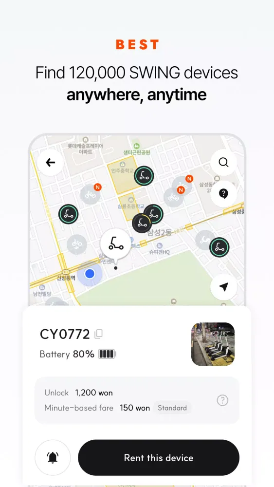 SWING operates in multiple cities across Korea, including Bundang, Gwangmyeong, Chuncheon, Wonju, Daejeon, Changwon, Bucheon, Yangju, Gumi, and Gimhae. With over 90,000 electric kick scooters available, SWING boasts the largest fleet in the country, surpassing the combined offerings of other major competitors like Zigoo, Singsing, and Beam.