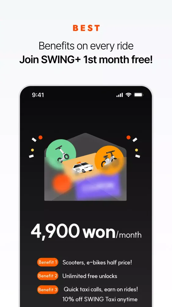SWING is a comprehensive mobility application designed to cater to a wide range of transportation needs in South Korea. Whether you're looking for a convenient way to hail a taxi, rent an electric scooter, or simply cruise around on a pedal bike, SWING has got you covered.