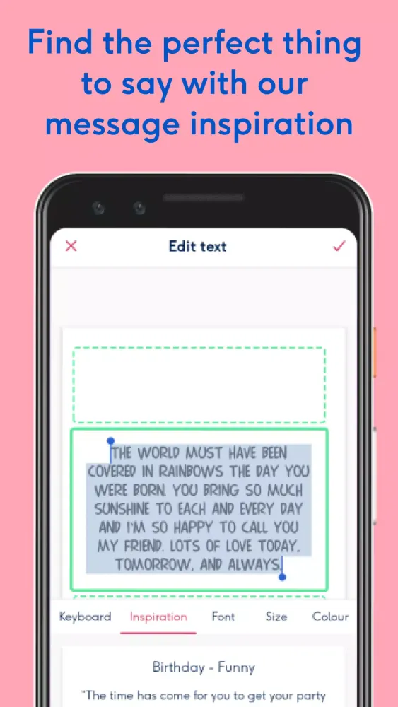But the Moonpig app is more than just a birthday card app. It offers a range of thoughtful features to help you personalize every aspect of your gift-giving experience. For instance, you can choose from a variety of card sizes, including standard, large, and giant cards, as well as postcards. You can also send your card directly to the recipient's mailbox or opt to receive it back signed if you prefer. And with Moonpig, you can send personalized cards anywhere in the world, with flexible delivery options to suit your needs.