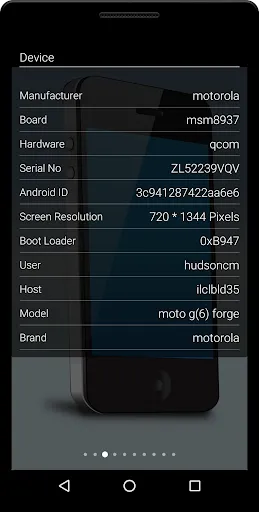 Brand, Manufacturer, Model, Board, Hardware, Serial Number, Android ID, Screen Resolution, Boot Loader, User, Host.