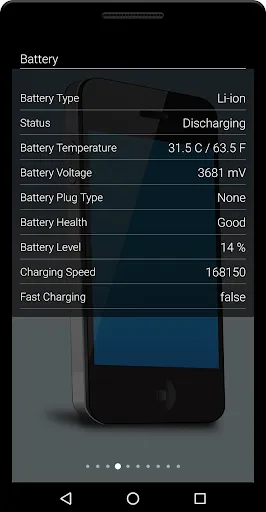 Battery Temperature in Celsius and Fahrenheit, Battery Voltage, Battery Plug Type, Battery Health , Battery Level, Status, Battery Type, Charging Speed, Fast Charging.