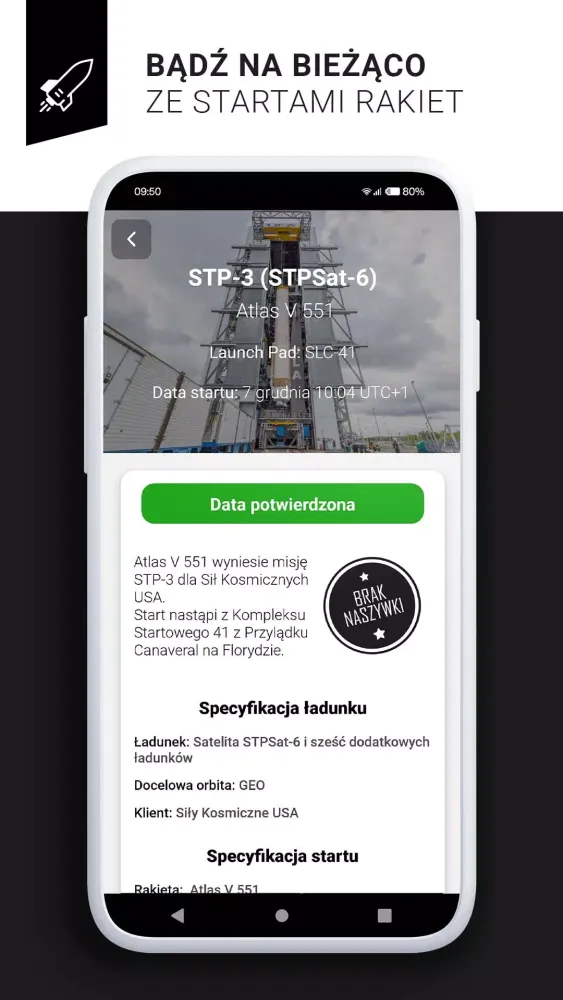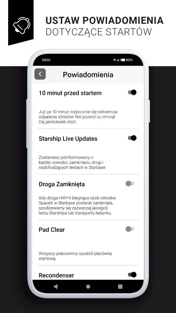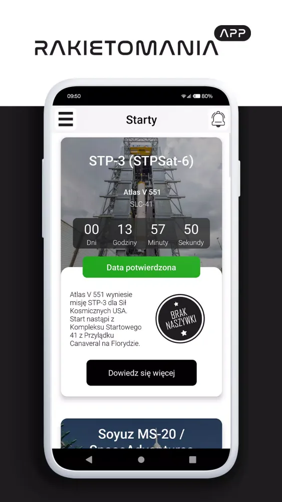 From now on, you will never miss another rocket launch! Our application is designed to keep you informed about upcoming rocket launches. With Rakietomania, you can customize notifications to your liking. Choose to receive a reminder 10 minutes, 1 hour, or 24 hours before the start, or even select all three options simultaneously.