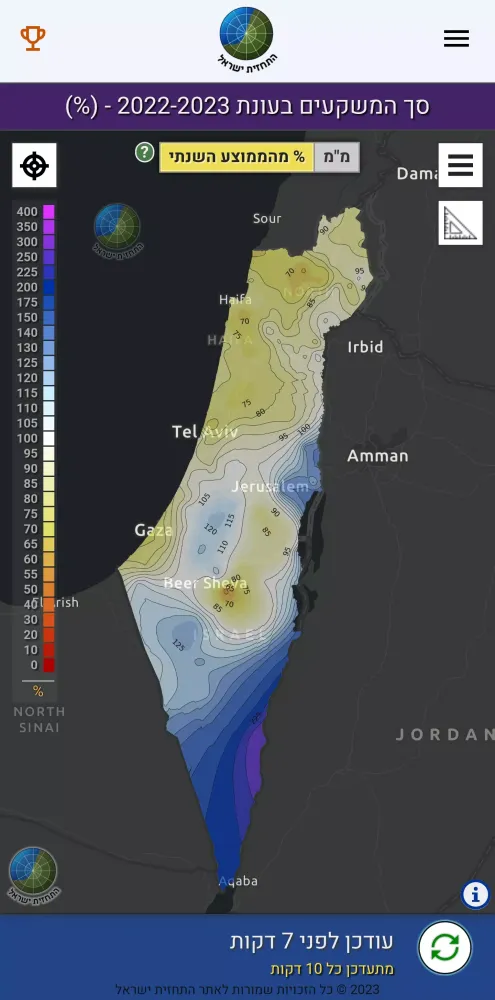 In addition to the rain radar, the app showcases its flagship project, codenamed "Suzie." This project presents real-time data using color-coded heat maps, illustrating the accumulated precipitation amounts over short and extended periods. These maps are generated through advanced interpolation techniques using data from numerous meteorological stations across Israel, including those operated by the Ministry of Agriculture, the Water Authority, and private entities.