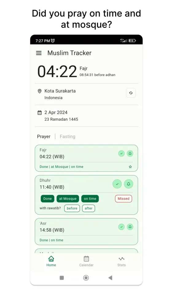 Never miss a prayer again with our intuitive prayer tracking feature. Whether you're at home, at work, or on the go, you can easily record each prayer session, indicating whether you prayed at the mosque, on time, or if it was missed. Stay accountable to your spiritual goals and maintain a consistent prayer schedule effortlessly.