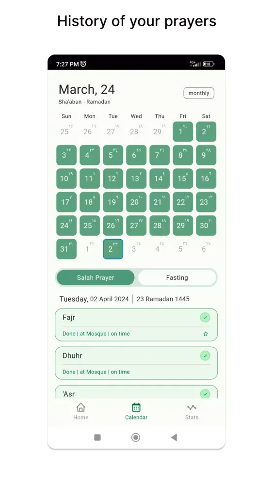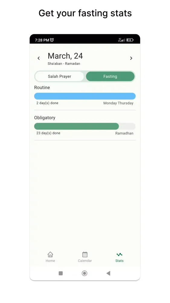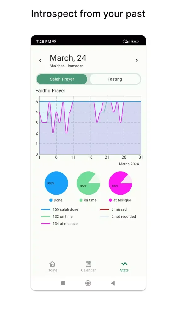 Track your progress over time with insightful statistics and visualizations. Monitor your prayer consistency, fasting frequency, and overall spiritual growth with easy-to-understand analytics. Celebrate milestones and stay motivated on your path towards spiritual fulfillment.
