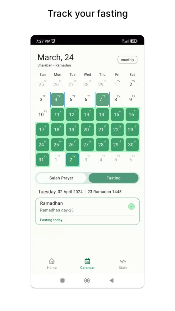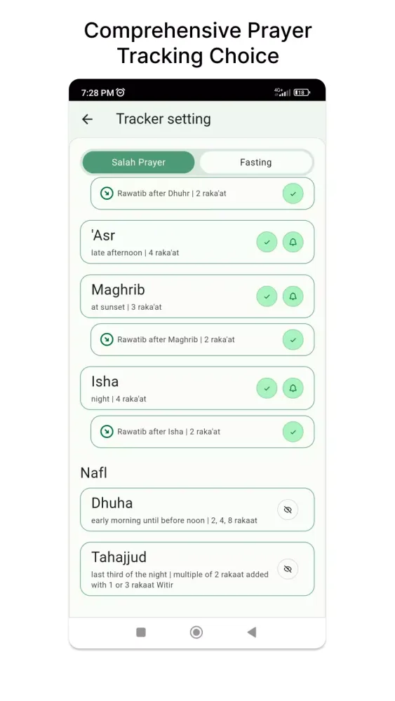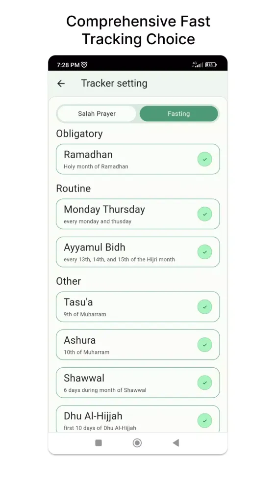 Fasting is an integral part of Islamic practice, and with Muslim Tracker, you have the flexibility to choose from various fasting types according to your preferences and beliefs. Whether it's Ramadan fasting, voluntary fasts, or other types of fasting, this app caters to your individual needs, ensuring a seamless fasting experience throughout the year.